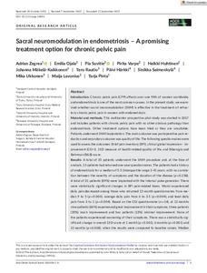 This multicenter prospective pilot study was started in 2017 and includes patients with chronic pelvic pain with no other obvious pathology than endometriosis. Other treatment options have been tried or they are unsuitable. Patients underwent SNM implantation. The main outcome was postoperative pain reduction and secondary outcome was quality of life. The following questionnaires were used to assess the outcomes: Brief pain inventory (BPI), clinical global impression - improvement (CGI-I), 15D-measure of health-related quality of life, and Biberoglu and Behrman (B&B) score.