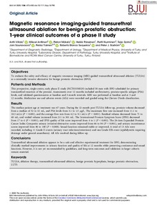 Patients and Methods This prospective, single-centre, early phase II study (NCT03350529) included 30 men with BPO scheduled for primary transurethral resection of the prostate. Assessments over 12 months included uroflowmetry, prostate-specific antigen (PSA) levels, and validated questionnaires at baseline and 3-month intervals. MRI was performed at baseline and at 3 and 12 months. Medication use and adverse events (AEs) were recorded and graded using the Clavien-Dindo classification.
