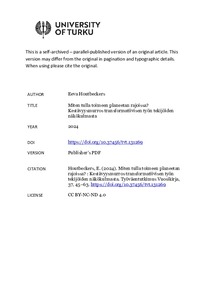 Vaikka kestävyysmurroksessa talouden ja työn edellytykset ovat muutoksessa, kestävän työelämän ymmärretään toteutuvan pääosin palkkatyössä. Tässä artikkelissa laajennan ymmärrystä työstä ja toimeentulosta kiinnittämällä huomiota jo olemassa olevaan, mutta herkästi piiloon jäävään sosiaalisesti ja ekologisesti kestävämpään työhön, jota tehdään muunakin kuin palkkatyönä. Tutkin ratkaisuja, jotka pyrkivät takaamaan yhteisöjen kestävän toimeentulon jo nykyisessä järjestelmässä, vaikka järjestelmä ei usein tuekaan kestävää paikallistatoimeentuloa, joka on palkkatyötä laajempaa. Sovellan teoreettisena ja käsitteellisenä viitekehyksenä vastuullisten urien tutkimusta, elävän talouden tutkimuksen ymmärryksiä toimeentulosta, institutionaalista etnografiaa sekä käytäntötutkimusta. Esitän tuloksia 23 haastattelusta 19 transformatiivisen työn tekijän kanssa. Vastaan kysymyksiin mitä, miksi ja miten transformatiivisen työn tekijät toimivat arjessaan ja keneksi he tulevat osana tätä toimintaa, sekä miltä planeetan kantokyvyn rajoihin mahtuva moninainen työ voisi näyttää.