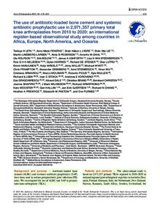 Background and purpose — Antibiotic-loaded bone cement (ALBC) and systemic antibiotic prophylaxis (SAP) have been used to reduce periprosthetic joint infection (PJI) rates. We investigated the use of ALBC and SAP in primary total knee arthroplasty (TKA). Patients and methods — This observational study is based on 2,971,357 primary TKAs reported in 2010–2020 to national/regional joint arthroplasty registries in Australia, Den-mark, Finland, Germany, Italy, the Netherlands, New Zealand, Norway, Romania, South Africa, Sweden, Switzerland, the UK, and the USA. Aggregate-level data on trends and types of bone cement, antibiotic agents, and doses and duration of SAP used was extracted from participating registries. Results — ALBC was used in 77% of the TKAs with variation ranging from 100% in Norway to 31% in the USA. Palacos R+G was the most common (62%) ALBC type used. The primary antibiotic used in ALBC was gentamicin (94%). Use of ALBC in combination with SAP was common practice (77%). Cefazolin was the most common (32%) SAP agent. The doses and duration of SAP used varied from one single preoperative dosage as standard practice in Bolzano, Italy (98%) to 1-day 4 doses in Norway (83% of the 40,709 TKAs reported to the Norwegian arthroplasty register). Conclusion — The proportion of ALBC usage in primary TKA varies internationally, with gentamicin being the most common antibiotic. ALBC in combination with SAP was common practice, with cefazolin the most common SAP agent. The type of ALBC and type, dose, and duration of SAP varied among participating countries.