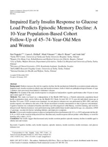 Background: Diabetes increases the risk for cognitive decline, but the mechanisms behind this association remain unknown. Impaired early insulin secretion in elderly men and insulin resistance, both of which are pathophysiological features of type 2 diabetes, have previously been linked to Alzheimer's disease.