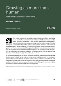This article focuses on Hanna Saarikoski’s video artwork C and specifically on the handcrafted suit made of artists’ charcoal that Saarikoski wears in the video. The title of the artwork, C, can be seen as a reference to both artists’ charcoal and carbon, as in the carbon footprint of humans in the age of climate emergency. I discuss the video work C from the perspective of ecocritical art that aims to raise awareness of human impact on the environment, relating to much-criticized anthropocentrism (‘human centeredness’). To explore how C works as ecocritical art and how it can challenge anthropocentrism both in artmaking and in the context of climate emergency, I will engage with the production process of the handcrafted suit and then examine how the artist and the charcoal suit co-draw in the video work C. In this inquiry, I foreground the notion of process autonomy that highlights the complex involvement of multiple human and non-human forces and fragments in the production process of an artwork. This kind of complex setting is always somewhat unpredictable, and hence what the work of art cannot be completely controlled by the artist alone; instead, the work of art will gain its own momentum. I propose that, in C, the performing artist and the charcoal suit become a more-than-human drawing agency.