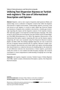 Keywords: web registers, linguistic variation, Turkish Corpus of Online Registers (TurCORE), register analysis, Informational Description, Opinion, Text Dispersion Keyword Analysis.