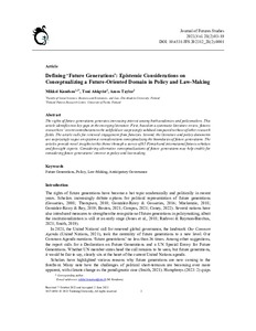 The rights of future generations generates increasing interest among both academics and policymakers. This article identifies two key gaps in the emerging literature. First, based on a systematic literature review, futures researchers’ recent contributions to the subfield are surprisingly subdued compared to those of other research fields. The article calls for renewed engagement from futurists. Second, the literature and policy documents are surprisingly vague on epistemic considerations conceptualising the boundaries of future generations. The articles provide novel insights to this theme through a survey of 65 Finnish and international futures scholars and foresight experts. Considering alternative conceptualizations of future generations may help enable for considering future generations’ interest in policy and law-making.