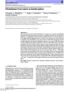 The classical limit on the accretion luminosity of a neutron star is given by the Eddington luminosity. The advanced models of accretion on to magnetized neutron stars account for the appearance of magnetically confined accretion columns and allow the accretion luminosity to be higher than the Eddington value by a factor of tens. However, the recent discovery of pulsations from ultraluminous X-ray source (ULX) in NGC 5907 demonstrates that the accretion luminosity can exceed the Eddington value up to by a factor of 500. We propose a model explaining observational properties of ULX-1 in NGC 5907 without any ad hoc assumptions. We show that the accretion column at extreme luminosity becomes advective. Enormous energy release within a small geometrical volume and advection result in very high temperatures at the bottom of accretion column, which demand to account for the energy losses due to neutrino emission which can be even more effective than the radiation energy losses. We show that the total luminosity at the mass accretion rates above 1021 g s(-1) is dominated by the neutrino emission similarly to the case of core-collapse supernovae. We argue that the accretion rate measurements based on detected photon luminosity in case of bright ULXs powered by neutron stars can be largely underestimated due to intense neutrino emission. The recently discovered pulsating ULX-1 in galaxy NGC 5907 with photon luminosity of similar to 10(41) erg s(-1) is expected to be even brighter in neutrinos and is thus the first known Neutrino Pulsar.