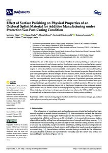 The aim of this study was to evaluate the effect of surface polishing as well as the post-curing atmospheres (air and nitrogen gas) on the physical properties of an occlusal splint material for additive manufacturing. Flexural strength, flexural modulus, Vickers hardness number (VHN), degree of carbon double bond conversion (DC), water sorption (W-SP), and water solubility (W-SL) were evaluated. Surface polishing significantly affected the evaluated properties. Regardless of the post-curing atmosphere, flexural strength, flexural modulus, VHN, and DC showed significantly higher values for the polished specimens when compared with the unpolished ones, while W-SP and W-SL were significantly lower for the polished specimens. Unpolished specimens post-cured at nitrogen gas showed significantly higher VHN and DC values. However, the effect of the post-curing at a nitrogen gas atmosphere was non-significant in polished specimens. The current results suggested that surface polishing plays a role in the physical properties of the evaluated occlusal splint material and can enhance all the evaluated properties regardless of the post-curing atmosphere. Meanwhile, the post-curing at a nitrogen gas atmosphere can enhance the VHN and DC but its effect is confined only to the surface layers, which can be removed during surface polishing.