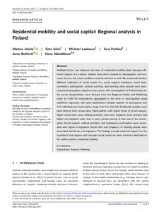Multiple factors can influence the rates of residential mobility flows between different regions of a country. Studies have often focused on demographic and economic factors, but social conditions may be relevant as well. We examined whether different indicators of social capital (i.e., social support, loneliness, social trust, community participation, cultural activities, and meeting other people) were associated with population migration rates across 299 municipalities of Finland. Data for the social characteristics were derived from the Regional Health and Wellbeing study (n = 100,750 respondents) aggregated to the level of municipalities using multilevel regression with post-stratification (median number of participants was 115 individuals per municipality, range from 5 to 10,616). Residential mobility rates were derived from census data. Municipalities with higher levels of social support, higher social trust, more cultural activities, and more frequent social contacts had higher net migration rates, that is, more people moving in than out of the municipality. Social support, cultural activities, and community participation were associated with higher in-migration. Social trust and frequency of meeting people were associated with lower out-migration. The findings provide empirical support for the hypothesis that regions with stronger social capital are more attractive destinations for within-country residential mobility.