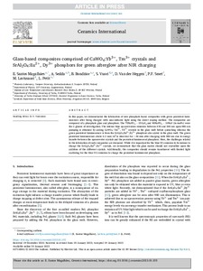 Glass-based composites comprised of CaWO4:Yb3+, Tm3+ crystals and SrAl2O4:Eu2+, Dy3+ phosphors for green afterglow after NIR charging