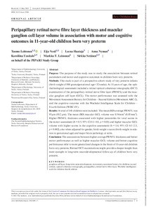 Results: A total of 141 children were included. The mean (SD) average PRNFL was 95 μm (10.2 μm). The mean (SD) macular GCL volume was 0.34 mm3 (0.03 mm3 ). Higher PRNFL thickness associated with higher percentiles for total scores in the motor assessment (b = 0.5, 95% CI 0.1-0.8, p = 0.01) and higher macular GCL volume with higher scores in the cognitive assessment (b = 1.4, 95% CI 0.5-2.3, p = 0.002), also when adjusted for gender, birth weight z-score (birth weight in relation to gestational age) and major brain pathology at term.