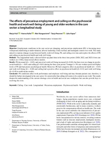 Employment conditions in the care sector are changing, and precarious employment (PE) is becoming more widespread, manifesting as undervaluation, adverse leadership, work overload, and inadequate control over work. This study aimed to examine changes in psychosocial health, work well-being, PE, and calling over time and explore the effects of PE and calling on psychosocial health and work well-being.