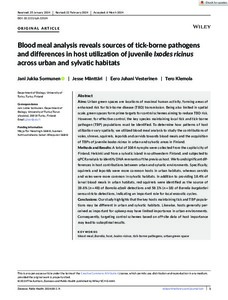 Aims: Urban green spaces are locations of maximal human activity, forming areas of enhanced risk for tick-borne disease (TBD) transmission. Being also limited in spatial scale, green spaces form prime targets for control schemes aiming to reduce TBD risk. However, for effective control, the key species maintaining local tick and tick-borne pathogen (TBP) populations must be identified. To determine how patterns of host utilization vary spatially, we utilized blood meal analysis to study the contributions of voles, shrews, squirrels, leporids and cervids towards blood meals and the acquisition of TBPs of juvenile Ixodes ricinus in urban and sylvatic areas in Finland.
