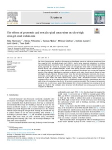 The effect of geometric and metallurgical constraints on the ultimate capacity of weldments manufactured from direct-quenched (DQ) ultra-high strength steel (UHSS) is studied using numerical calculations. In addition, experimental tests are conducted to prove the phenomena in practice. DQ steels behave differently under static loading, especially their weldments, compared to the same-strength class steels, which are manufactured using different alloying and fabrication techniques. In these steels welding generates a distinct softened region at the heat-affected zone (HAZ), which, in certain conditions, can influence the ultimate load-carrying and elongation capacity of the weldment. Metallurgical constraints can form in welds where the soft zone is adjacent to zones with higher strength. Moreover, the current study shows that not only metallurgical constraints, but also geometric ones, can strengthen weldments depending on the joint type. Removing the geometrical constraints from weldments slightly reduces the ultimate load-carrying capacity, while a remarkable reduction is seen in the elongation capacity of the joint. Numerical analysis conducted for non-load carrying X-joints indicates that as the width of the soft zone increases, the effect of the geometric constraint diminishes. Thus, it appears that geometric constraints can, in certain cases, prevent the detrimental effect of strain localization from occurring in the soft regions in at the HAZ. This mechanism seems to increase both the ultimate load-carrying capacity and ultimate elongation of weldments.