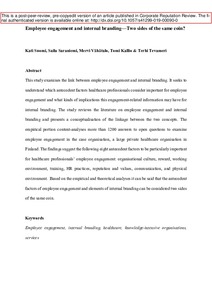 This study examines the link between employee engagement and internal branding. It seeks to understand which antecedent factors healthcare professionals consider important for employee engagement and what kinds of implications this engagement-related information may have for internal branding. The study reviews the literature on employee engagement and internal branding and presents a conceptualisation of the linkage between the two concepts. The empirical portion content analyses more than 1200 answers to open questions to examine employee engagement in the case organisation, a large private healthcare organisation in Finland. The findings suggest the following eight antecedent factors to be particularly important for healthcare professionals’ employee engagement: organisational culture, reward, working environment, training, HR practices, reputation and values, communication, and physical environment. Based on the empirical and theoretical analyses, it can be said that the antecedent factors of employee engagement and elements of internal branding can be considered two sides of the same coin.