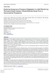 Conclusions:A cocreation process between pregnant users and the eHealth system was identified, illustrating access as a useful core component of perinatal eHealth self-monitoring systems. Researchers and clinicians can observe reasons for why pregnant users access eHealth systems in unique ways based on their personal preferences, habits, and values. Mediation activities of the eHealth system and the different user adaptive activities represent a cocreation process between the users and the eHealth system that is necessary for the personalization of perinatal eHealth systems.