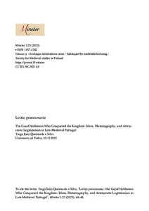centralisation. It examines how the medieval Portuguese aristocracy utilized memories of past interactions with Islam to justify its privileged social status and defend its traditional prerogatives at a time when this social group opposed the royalist policy of political centralization. This research is included into wider debates on the role of culture — in this case, historical culture — as a resource to justify, reinforce, reproduce, and transform an existing social order.