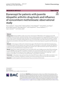 Methods: In this study, we collected the medical record data of 180 JIA patients from eight Finnish pediatric rheumatological centres. All these patients were treated with ETN monotherapy or combination therapy with DMARD. To evaluate the ETN concentrations, blood samples of the patients were collected between injections right before the subsequent drug. Free ETN level was measured from serum.