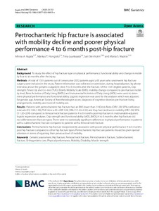 Conclusions: Pertrochanteric hip fracture independently associated with poorer physical performance 4 to 6 months post hip fracture compared to other hip fracture types. Pertrochanteric hip fracture patients should be given special attention in terms of regaining their previous level of mobility.