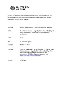 Anti-bullying interventions often assume that knowing how it feels to be bullied increases empathy for victims. However, longitudinal research on actual experiences of bullying and empathy is lacking. This study investigated whether within-person changes in victimization predicted changes in empathy over one year using random-intercept cross-lagged panel models (RI-CLPMs). Self- and peer-reported victimization, and cognitive and affective empathy for victims were measured in a sample of 15,713 Finnish youth (Mage = 13.23, SDage= 2.01, 51.6% female; 92.5% had Finnish-speaking parents; data was collected in 2007-2009 when information about participants’ race/ethnicity was not available due to ethical guidelines for the protection of personal information). Results indicated small, positive longitudinal associations from victimization to cognitive empathy. Implications for empathy-raising interventions are discussed.