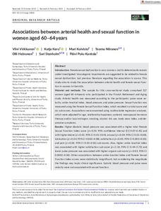 The sample for this cross-sectional study comprised 117 women (aged 60–64 years) who participated in the Finnish Retirement and Aging study. Arterial health was measured according to the participants' pulse wave velocity, ankle–brachial index, blood pressure, and pulse pressure. Sexual function was measured using the Female Sexual Function Index, which resulted in a total score and six sub-scores. Associations were examined using multivariable regression analyses, which were adjusted for age, relationship happiness, systemic menopausal hormone therapy and/or local estrogen, smoking, alcohol risk use, body mass index, and depressive symptoms.