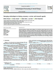 Emerging technologies, including artificial intelligence (AI), blockchain, machine learning, big data, and the Internet of Things, play a pivotal role in sharing economy (SE) services. Empirical studies on the roles of these emerging technologies in SE are increasing. However, the existing studies are highly fragmented, and the current literature fails to provide a comprehensive understanding of the role these technologies play in SE. Employing AI-based machine-learning topic modeling techniques, this systematic literature review identifies dominant research areas and maps the research related to the role of emerging technologies in SE. Our content analysis identified nine themes organized into four broad categories. Based on these findings, we have developed an integrated framework and provided insights into future research avenues. Furthermore, based on the findings, we provide theoretical and practical implications.