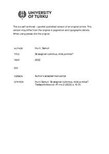 Kirjoituksen aiheena on strateginen tutkimus – mitä se on ja miksi sitä tehdään? Aihetta tarkastellaan tieteen omasta näkökulmasta, toisin sanoen kirjoituksessa analysoidaan strategisen tutkimuksen vaikutuksia tutkimuksen kentällä. Analyysin muoto on mertonlainen tieteesosiologia. Sen mukaisesti huomio kiinnitetään tutkimuksenteon arvoihin ja normeihin tieteellisen toiminnan kentän rakenteina. Kirjoituksen jäsennys muodostuu strategista tutkimusta luonnehtivista yleisistä piirteistä. Näitä ovat ilmiöpohjaisuus, tiedon luotettavuus, monitieteisyys ja yhteiskunnallinen vaikuttavuus. Strategista tutkimusta verrataan kestävyystieteeseen ja eron tekemisessä hyödynnetään Michel Foucault’n ajatusta strategian logiikasta. Lopuksi aihetta katsotaan lyhyesti yhteiskunnan näkökulmasta.