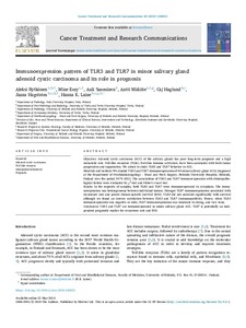 Materials and methods: We studied TLR3 and TLR7 immunoexpression of 46 minor salivary gland ACCs diagnosed at the Department of Otorhinolaryngology - Head and Neck Surgery, Helsinki University Hospital, Helsinki, Finland over the period 1974-2012. The associations of TLR3 and TLR7 immunoexpression with clinicopathological factors were evaluated by χ2-test and Fisher's exact test.
