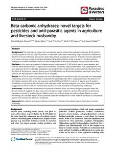 The predicted mitochondrial localization of several β-CAs and hidden antigenic epitopes within the protein molecule, suggest that they may not be considered major targets for vaccines. Instead, they are promising candidate enzymes for small-molecule inhibitors which can easily penetrate the cell membrane. Based on current knowledge, we conclude that β-CAs are potential targets for development of small molecule pesticides or anti-parasitic agents with minimal side effects on vertebrates.