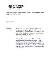 This chapter constitutes a narrative review on the so-called pathological language mixing and switching, with primary focus on multilingual persons with aphasia. Domain-general cognitive control is assumed to be a central aspect of bilingual language use and is strongly involved in switching between languages. However, this assumed relationship has not received the empirical scrutiny it deserves. In this review, we ask whether and when language switching/mixing in brain-damaged participants should be considered a control deficit and when it can be better characterized as a communicative strategy of the participants. We present opposing views on the legitimacy of using the term pathological switching/mixing and propose a way of reconciling these views. We also ask to what extent possible language control deficits underlying so-called pathological switching/mixing overlap with domain-general cognitive control functions, as measured by tasks of executive functions, and look into the neural correlates of these functions. This question addresses the relationship between language control and domain-general cognitive control. It therefore also touches upon the underlying assumptions behind the idea that frequent language switching/mixing could train cognitive control functions, possibly leading to a bilingual advantage in cognitive abilities, a hotly debated topic.