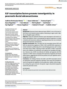 Methods and results: Here, we report that the transcription factors E2F1 and E2F8 are potential key regulators in PDAC. E2F1 and E2F8 RNA expression is mainly localized in proliferating cells in the developing pancreas and in malignant ductal cells in PDAC. Silencing of E2F1 and E2F8 in PANC-1 pancreatic tumor cells inhibited cell proliferation and impaired cell spreading and migration. Moreover, loss of E2F1 also affected cell viability and apoptosis with E2F expression in PDAC tissues correlating with expression of apoptosis and mitosis pathway genes, suggesting that E2F factors promote cell cycle regulation and tumorigenesis in PDAC cells.