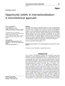 We propose the concept of opportunity belief as a means of understanding individuals as the interpreters of their contexts over the internationalization process of a firm. To illustrate the concept, we conducted a microhistorical analysis on one of the largest forest industry MNEs with an internationalization history of more than 150 years. Historical archival data and rich secondary material provided access to the reasonings of individuals over the firm’s internationalization. This allowed depiction of different types of opportunity beliefs as the drivers of internationalization actions within particular historical contexts. We portray opportunity belief as a complementary lens to current internationalization models focusing primarily on firm-level development.