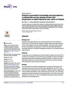 A nationwide survey of physicians and nurses working in intensive care units of Finnish tertiary care hospitals was conducted to gain knowledge and explore perceptions regarding the prevention of healthcare-associated infections in intensive care units. Descriptive statistics were used to describe the study data, and a mainly nonparametric method was used to compare the groups.