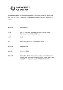 This article examines how literature education has changed in Finnish upper secondary school and what kind of theoretical background assumptions are made in the processing of literature. Early on, the aim of teaching literature in Finnish upper secondary schools was to emphasize national identity. Literary works about Finnish people were considered the strength of the young nation. The teaching of literature focused on learning national literature, and on knowing the authors and their works. From the 1950s onwards, new criticism influenced the teaching of literature, and close reading became the key tool for approaching literature. Gradually, the teaching of literature expanded from national literature to young adults’ literature, popular literature, and contemporary literature. In the 1980s, various literary approaches and background theories were emphasized in the learning materials. However, current literary teaching is still tied to new critical and formalistic theory. At the end of the article, the question is asked whether it would be necessary to change this approach so that literature would continue to attract young readers.