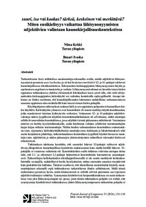 Käyttöpohjaisen näkemyksen mukaan kieli ja sen oppiminen pohjautuvat luonnollisen kielen käyttöön. Kielenkäytön ytimessä ovat konstruktiot eli muoto-merkitys-käyttö-kombinaatiot, jotka muodostavat toisiinsa kytkeytyvän verkoston. Vertaamme S2- ja S1-puhujien adjektiivivalintoja niiden tyypilliseen käyttöön konstruktionäkökulmasta eli selvitämme, mitkä muuttujat selittävät sanavalintaa konstruktiossa, jossa adjektiivi toimii pääsanansa määritteenä. Varsinainen aineisto on kerätty kyselytutkimuksella, mutta käytämme valintaa selittävinä taustamuuttujina laajaa kirjoa erilaisia taustamuuttujia. Näihin kuuluu valinnanalaisen konstruktion ominaisuuksia (mm. sijamuoto), kielenkäyttäjäkohtaisia muuttujia (mm. kielitausta ja lukutottumukset) sekä useita korpuksista johdettuja, tarkastelunalaisen konstruktion tyypillistä käyttöä kuvaavia muuttujia (mm. adjektiivien ja niiden pääsanojen yhteisesiintymien suhteelliset vahvuudet kielen eri rekistereissä).