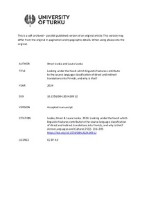 The study of features that affect the linguistic form of translated texts has been one of the central questions within the field of corpus-based translation studies. In the partially overlapping field of computational linguistics, previous studies have shown that source languages of individual texts can be detected automatically in direct translations and indirect translations (i.e., translations done from translations). However, computationally oriented approaches have paid limited attention to what specific linguistic features make successful classification possible. Consequently, the types of linguistic phenomena characterizing translations and the kinds of linguistic interference that can be detected in them remain underexplored. In this study, we study the linguistic features that contribute to the identification of the source language of direct translations from English, French, German, Greek, and Swedish, as well as indirect translations from Greek into Finnish, with English, French, German, and Swedish as mediating languages. Theoretically, this study builds on Halverson’s (2017) gravitational pull model to explain the mechanisms behind our findings in a theoretically sound fashion and to generate theoretically motivated, specific hypotheses to be tested by future research. The analysis makes use of keyness analysis as a supervised machine learning technique, as well as exploratory factor analysis (EFA) as an unsupervised machine learning technique. The results indicate that sentence length, sentence-initial adverbs and sentence-final specification are the linguistic features that set the different types of translations apart from each other. Furthermore, the salient features of the ultimate source language outweigh those of the mediating languages in indirect translations or the entrenched parallels between specific language pairs. The study of features that affect the linguistic form of translated texts has been one of the central questions within the field of corpus-based translation studies. In the partially overlapping field of computational linguistics, previous studies have shown that source languages of individual texts can be detected automatically in direct translations and indirect translations (i.e., translations done from translations). However, computationally oriented approaches have paid limited attention to what specific linguistic features make successful classification possible. Consequently, the types of linguistic phenomena characterizing translations and the kinds of linguistic interference that can be detected in them remain underexplored. In this study, we study the linguistic features that contribute to the identification of the source language of direct translations from English, French, German, Greek, and Swedish, as well as indirect translations from Greek into Finnish, with English, French, German, and Swedish as mediating languages. Theoretically, this study builds on Halverson’s (2017) gravitational pull model to explain the mechanisms behind our findings in a theoretically sound fashion and to generate theoretically motivated, specific hypotheses to be tested by future research. The analysis makes use of keyness analysis as a supervised machine learning technique, as well as exploratory factor analysis (EFA) as an unsupervised machine learning technique. The results indicate that sentence length, sentence-initial adverbs and sentence-final specification are the linguistic features that set the different types of translations apart from each other. Furthermore, the salient features of the ultimate source language outweigh those of the mediating languages in indirect translations or the entrenched parallels between specific language pairs.