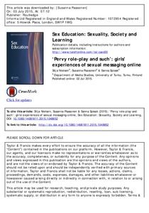 Sexting is one of the recurring causes of concern in public discussion of young people and network media. This paper builds on findings from a survey with 1269 Finnish female respondents aged 11–18 conducted using a popular online community for girls on their experiences of and views on online messages concerning sex and sexuality. Sixty-five per cent of respondents had received messages related to sex from either adults or minors while 20% had also sent such messages themselves. The paper asks how girls experience and make sense of sexual messaging and what motivates them to engage in such interactions. Specific attention is paid to the distinction between unwanted and wanted messages. While messages from unknown people identified as adult were often discussed as unpleasant or ‘creepy’, sexual messaging, role-play, cybersex experiments and discussions related to sex among peers were defined as fun and pleasurable. Girls display notable resilience and describe coping strategies connected to unwanted messaging but equally frame sexual messaging and role-play as issues of choice motivated by curiosity and pleasure. The paper addresses sexual messaging as a form of sexual play and learning, and argues for the importance of contextual analysis in understanding its forms and potentialities.