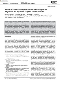 Viologen derivatives feature two reversible one-electron redox processes and have been extensively utilized in aqueous organic flow batteries (AOFBs). However, the early variant, methyl viologen (MVi), exhibits low stability in aqueous electrolytes, restricting its practical implementation in AOFB technology. In this context, leveraging the tunability of organic molecules, various substituents have been incorporated into the viologen core to achieve better stability, lower redox potential, and improved solubility. In this work, we introduce bisphosphonate-substituted viologens (BBPE−Vi and MBPE−Vi) as candidates for AOFBs. The bulkiness and negative charges of the bisphosphonate groups enhance the solubility and the electrostatic repulsion among viologen molecules, minimizing the bimolecular side reactions that lead to degradation. Additionally, the electron-rich character of this new substituent in its deprotonated state significantly lowers the redox potential. As a result, the proposed viologen derivatives exhibit high solubility (1.45 M in water) and stability (capacity decay of 0.009 %/cycle or 0.229 %/day when tested at 0.5 M). These parameters are coupled with the lowest redox potentials exceeding all previously reported viologens utilized in AOFBs (−0.503 V and −0.550 V against SHE for MBPE−Vi and BBPE−Vi, respectively).