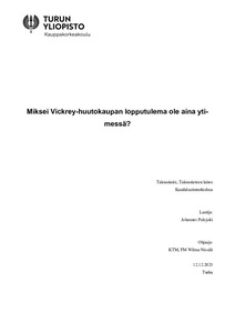 Tutkielmassa käsitellään huutokauppateoriaa, keskittyen erityisesti Vickrey-huutokauppaan, joka on yksi yleisimmistä huutokauppamekanismeista. Tutkielmassa arvioidaan Vickrey-huutokaupan soveltuvuutta eri huutokauppaympäristöissä ja tarkastellaan, miksei Vickrey-huutokauppa johda aina tehokkaisiin lopputulemiin. Tutkielmassa keskeistä on esitellä huutokauppateoria myös Vickrey-huutokaupan ulkopuolella ja esitellä Vickrey-huutokaupan ratkaisuksi ehdotetun ytimen valitsevan huutokaupan toimintaperiaate.
