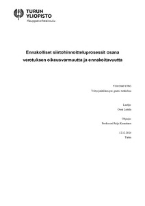 Verotuksessa ennakoitavuuden tarpeen voi nähdä suurempana kuin monilla muilla hallinnollisilla aloilla. Verotus kohdistuu taloudelliseen toimintaan ja täten on tärkeää, että verovelvollinen voi ennen suunnittelemaansa toimeen ryhtymistä varmistua toimen verokohtelusta. Erityisesti siirtohinnoittelussa ennakoitavuuden tarve on suurta, sillä siirtohinnoittelun on esitetty muodostavan yritysverotuksessa laajimman ja vaikeimman epävarmuustekijän. Ennakoitavuuden tärkeyttä lisää vielä se, että joidenkin arvioiden mukaan jopa 60 % maailmankaupasta on konsernien sisäistä, siirtohinnoittelun piirissä olevaa kauppaa. Tutkielman tarkoituksena onkin perehtyä siihen, millaisia ennakollisia siirtohinnoitteluprosesseja verovelvollisilla on käytössään verotuksen oikeusvarmuuden ja ennakoitavuuden vahvistamiseksi. Lisäksi tutkielmassa pyritään selvittämään, miten nykyiset ennakolliset siirtohinnoitteluprosessit vaikuttavat verotuksen oikeusvarmuuteen ja ennakoitavuuteen sekä pureutumaan nykyisten ennakollisten siirtohinnoitteluprosessien ongelmallisuuksiin, erityisesti verotuksen oikeusvarmuuden ja ennakoitavuuden näkökulmasta. Tutkimuksen tarkoituksena onkin olla veropoliittinen katsaus kyseisiin teemoihin, oikeuskirjallisuutta hyväksikäyttäen. Lisäksi tutkimuksen aihetta lähestytään osaltaan empiirisellä lähestymistavalla, joka luo tutkielmaan vaikuttavuutta ja luotettavuutta, sekä mahdollistaa tutkimuskysymyksiin vastaamisen osittain kokemusperäisen tiedon perusteella. Tutkielmassa tarkastellaan myös legaliteettiperiaatetta verotuksen oikeusvarmuuden ja ennakoitavuuden takaavana oikeusperiaatteena, erityisesti verotusmenettelystä annetun lain 31 §:n ja OECD:n siirtohinnoitteluohjeiden näkökulmasta. Siirtohinnoittelussa käytettäviä siirtohinnoittelumenetelmiä sivutaan myös esittelynomaisesti, jotta lukija pystyy muodostamaan peruskäsityksen siirtohinnoittelumenetelmien moninaisuudesta ja niiden soveltamisen vaativuudesta osana siirtohinnoittelun dokumentaatioprosessia, joka mahdollisesti altistaa verovelvollisen erilaisille veroriskeille. Kerätyn haastatteluaineiston perusteella näyttäisi siltä, että nykyiset ennakolliset siirtohinnoitteluprosessit auttavat verovelvollisia vahvistamaan näiden verotuksen oikeusvarmuutta ja ennakoitavuutta. Eri prosesseilla huomataan olevan käyttötarkoituksia erilaisissa tilanteissa ja aineiston perusteella voidaan myös tehdä päätelmää prosessien toimivuudesta suhteessa toisiinsa. Empirian perusteella päädytään myös siihen, että prosessit eivät ole kuitenkaan ongelmattomia, eikä kehitysehdotuksiltakaan vältytä. Yleisesti voidaan myös todeta, että lopulta kaiken keskiössä ennakollisten prosessien toimivuuden kannalta on viranomaisten käytettävissä olevat resurssit, jotka osaltaan takaavat prosessien tehokkuutta ja joustavuutta. Veroriskien hallinnan näkökulmasta myös verovelvollisen laatima siirtohinnoittelustrategia on erittäin tärkeässä roolissa, sillä viime kädessä kansainvälisessä verotuksessa jokaiselta eri valtion veroviranomaisen liikkeeltä ei voi ennakollisilla prosesseillakaan pelastua.