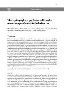 Potilasturvallisuus määritellään terveydenhuollon organisaatioiden ja niissä toimivan henkilös-tön periaatteiksi ja toiminnoiksi, joilla varmistetaan hoidon turvallisuus ja suojataan potilasta va-hingoittumasta. Yhteispäivystyksen toiminnan turvallisuus vaikuttaa potilaiden hoitopolkuun ja hoidon tuloksiin. Nopea kehitys terveydenhuollon eri osa-alueilla tuo runsaasti uusia osaamistar-peita myös yhteispäivystykseen. Tämän tutkimuksen tavoitteena oli selvittää yhteispäivystyksen hoitoprosessiin liittyviä potilasturvallisuuden varmistamisen kannalta tärkeitä osaamistarpeita. Tutkimukseen haastateltiin päivystyksessä työskentelevää henkilökuntaa (n=15). Aineisto ana-lysoitiin induktiivisella teema-analyysillä. Tutkimuksessa havaittiin, että henkilökunnan käsitys potilasturvallisuudesta vaihtelee konkreettisesta abstraktiin . Potilasturvallisuuden varmistami-sen haasteita tunnistettiin laaja-alaisesti. Toisaalta henkilökunta ehdotti useita potilasturvalli-suutta parantavia ratkaisuja. Tutkimuksen tulosten perusteella muodostettiin holistinen malli potilasturvallisuuden osaamistarpeisiin vaikuttavista tekijöistä yhteispäivystyksen kontekstis-sa. Potilasturvallisuuden osaamistarpeita ja osaamisen kehittämistä tulisi tarkastella kokonais-valtaisesti yhteispäivystyksen monimutkaisessa toimintaympäristössä. Tunnistetut osaamistarpeet perustuvat käsityksille potilasturvallisuudesta ja potilasturvallisuuskulttuurista. Yhteinen käsite-malli mahdollistaa organisaation, henkilöstön ja potilaiden voimavarojen kohdistamisen potilas-turvallisuuden parantamiseen. Kehitettyä mallia voidaan hyödyntää potilasturvallisuuskoulutuksia tai työssä oppimisen interventioita suunniteltaessa.