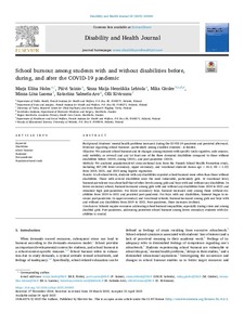 Results: At all school levels, students with any disabilities reported school burnout more often than those without disabilities. Those with several disabilities were the most vulnerable, particularly girls. At vocational level, burnout prevalence was about half that of other levels among girls and boys with and without any disabilities. In lower secondary school, burnout increased among girls with and without any disabilities from 2019 to 2021 and remained high post-pandemic. For lower secondary boys, burnout increased only among those without disabilities from 2019 to 2021 and persisted post-pandemic. For boys with any disabilities, burnout began to increase post-pandemic. In upper secondary and vocational schools, burnout increased among girls and boys with and without any disabilities from 2019 to 2021. Post-pandemic, these increases declined.