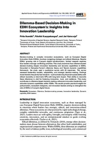 Decision-making in complex innovation ecosystems, such as European Digital Innovation Hubs (EDIHs), involves navigating strategic and ethical dilemmas. Despite EDIHs’ growing role in Europe’s digital transformation, limited research explores how leaders manage conflicting priorities. This study examines how dilemma-based decision-making shapes innovation leadership and dynamic capabilities in EDIHs. Grounded in Hampden-Turner’s dilemma theory and Teece’s dynamic capabilities framework, the study used a qualitative survey with 20 responses. The survey assessed leadership models, adaptability, and strategic decision-making. Findings reveal leaders frequently face tensions—such as balancing financial sustainability with ethical neutrality or short-term KPIs with long-term impact. Their ability to reconcile these dilemmas is vital for fostering innovation, trust, and resilience. This study contributes to dilemma-based decision-making, enhances innovation leadership, and activates dynamic capabilities within EDIHs. The results provide practical insights for policymakers, ecosystem designers, and innovation leaders aiming to strengthen the role of EDIHs in Europe’s digital future.