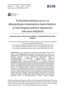 Tässä tutkimuksessa tarkastellaan, mitkä tekijät tukevat lasten käsityö- ja teknologiaprojektien ohjaamista varhaiskasvatuksessa sekä esi- ja alkuopetuksessa. Tutkimuksessa keskitytään pienten oppilaiden oppimisprosesseja ohjaavien opettajien ja muun henkilökunnan kokemuksiin käsityö- ja teknologiaprojektien ohjaamisesta. Tutkimusaineisto pohjautuu ryhmähaastatteluihin (N = 7) sekä henkilöstön laatimiin käsityö- ja teknologiakasvatuksen kehittämissuunnitelmiin (N = 9). Aineisto analysoitiin laadullisella sisällönanalyysilla. Analyysissa aineistosta muodostui kolme pääteemaa käsityö- ja teknologiaprojektien ohjaamiseen liittyvistä tekijöistä: 1) lasten aktiivinen toiminta, 2) monipuoliset oppimisympäristöt, sekä 3) yhteisopetus ja yhteisöllisyys. Käsityö- ja teknologiakasvatuksen projekteissa keskeisestä oli lasten aktiivisen suunnittelu- ja työskentelytaitojen tukeminen. Yhteisopetus sekä yhteistyö lapsen perheen ja koulun ulkopuolisten tahojen kanssa korostui henkilöstön kokemuksissa. Laajenevat oppimisympäristöt, kuten metsän hyödyntäminen opetuksessa, koettiin tärkeänä oppimisen edistäjänä. Oppimisympäristöjen laajentaminen ja yhteistyön kehittäminen nähtiin mahdollisuutena tukea oppilaiden aktiivista osallistumista ja oppimista käsityö- ja teknologiaprojekteissa. Tuloksia voidaan hyödyntää varhaiskasvatuksen sekä esi- ja alkuopetuksen opettajien perus- ja täydennyskoulutuksessa.