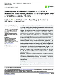 The new medication review (MR) competence assessment method consisted of (1) a self-assessment by pharmacy students and (2) a performance assessment by their MR specialized preceptors at the completion of the advanced-level pharmacy internship during the third study year at the University of Helsinki, Finland. The assessment applied a structured and validated electronic evaluation tool based on national MR competence recommendations for pharmacists (31 items).