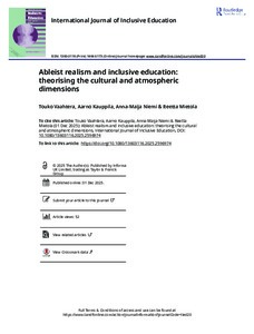 Invoking realism is one of the overlooked forms of ableism in the discussions of disability studies and inclusive education. By introducing the concept of ableist realism, the aim of the article is to show how such forms of ableism could be theorised. Authors understand ableist realism to be a mentality and an atmosphere, where understanding disability as a deficiency and considering disabled people’s needs inappropriate to general societal settings are evoked as part of an inescapable reality. From the perspectives of cultural studies and by drawing on qualitative research authors re-examine their existing data from their earlier projects in various educational settings. The datasets include expert interviews and life-historical interviews with young people. The authors first explore how special education experts use the idea of realism when considering inclusive education. After that they turn to the accounts of young people who have received special education, explore their accounts about career guidance, and consider what perspectives the idea of atmosphere brings to the exploration of ableist realism.