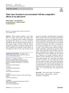 Whilst temporal dynamics of the abundance of invasive alien species has gained interest, less is understood about complex interactions determining their impacts on, e.g., how coexistence mechanisms and the resulting ecological impact of alien species change with time. Using the invasive nitrogen-fixing Lupinus polyphyllus (lupine) and its native competitor Leucanthemum vulgaris (daisy), we investigated the effect of time since invasion on the growth of both plants, including lupine’s allelopathic effects on daisy. We set up a full-factorial greenhouse experiment that utilised activated carbon to neutralise putative allelopathic compounds in the soil in relation to non-treated soils. The used field soils with natural microbial communities and abiotic soil properties were exposed to lupine for ca. 5 years, 10 years or 15 years, or had no known prior exposure (controls). Lupine significantly suppressed the growth of daisy in the first month and its final biomass. However, lupine’s allelopathy did not appear to be the cause for the suppression of daisy seedlings that were grown next to lupine for two months. In addition, while the biomass of daisy benefitted from growing in previously lupine-invaded soils, both daisy and lupine, and their coexistence were not affected by the time soil was exposed to lupine. These results demonstrate that while time since invasion could be important for ecological impacts of some invasive alien plants or in older invasions, the suppressive effect of the invasive lupine on 1–3-month-old daisy was immediate and stable.