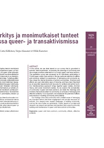 ja siihen kiinnittyviä monimutkaisia tunteita kotimaisessa queer- ja transaktivistismissa. Laadulliseen kyselyyn vastasi 52 queer- ja/tai transaktivismiin osallistunutta henkilöä. Kiinnitämme erityistä huomiota affekteihin ja tunteisiin, jotka liittyvät yhteenkuuluvuuden kokemuksiin ja yhteisöön, sillä ne muokkaavat aktivismiyhteisön sisäistä toimintaa. Tunteita ja affekteja on teoretisoitu poliitikalle ja aktivistiselle toiminnalle välttämättömänä edellytyksenä ja resurssina, joka voi avata myös toisin tietämisen tapoja. Tieteidenvälisessä lähestymistavassamme yhdistämme queer-tutkimusta, feminististä teoretisointia sekä yhteiskunnallisten liikkeiden tutkimusta. Suhteutamme aktivistien yhteisöön liittämiä merkityksiä ja tunteita yhteenkuuluvuuden ja affektiivisen solidaarisuuden käsitteisiin pohtiessamme yhteisön monimutkaisuutta queer- ja transaktivismissa. Korostamme lähestymistavassamme affektien ja tunteiden potentiaalia yhteisön ja solidaarisuuden rakentamisessa.Tuloksemme osoittavat, että yhteisöllisyys ja yhteenkuuluvuuden tunne ovat vastaajille tärkeitä aktivismiin sitoutumista ja voimavaroja tukevia tekijöitä. Aineisto paljastaa myös haasteita yhteisön rakentamisessa ja ylläpitämisessä, esimerkiksi liittolaisten roolissa. Lopuksi esitämme aineiston ja tutkimuksen pohjalta näkökulmia ja käytäntöjä, jotka tukevat queer- ja transaktivistiyhteisöjen yhteisön rakentamista ja ylläpitämistä.