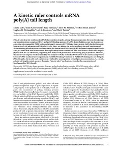 Poly(A) tails of newly synthesized mRNAs have uniform lengths, arising through cooperation between the cleavage and polyadenylation complex (CPAC) and poly(A) binding proteins (PABPs). In the budding yeast Saccharomyces cerevisiae, the responsible PABP is the evolutionarily conserved CCCH zinc finger protein Nab2 that facilitates the biogenesis of ∼60 adenosine mRNA poly(A) tails. Here, we address the molecular basis for such length control. Reconstituting polyadenylation reactions during the formation of Nab2:poly(A) RNA ribonucleoprotein particles in vitro, we found that Nab2 dimerization directs polyadenylation termination. The Nab2 dimer is stable only on poly(A) tails that are >25 adenosines, explaining how Nab2 avoids prematurely terminating poly(A) synthesis. However, the mature tail length is not determined by the footprint of Nab2 on the RNA but rather by the kinetic competition between CPAC-mediated tail elongation and Nab2 RNA binding. Variations in Nab2 RNA binding rate can shift poly(A) tail lengths, but in cells such variations are buffered by autoregulation of Nab2 protein concentration. As a result, poly(A) tail length control operates through a “kinetic ruler” mechanism, whereby the concentration of Nab2 quantifies RNA length.