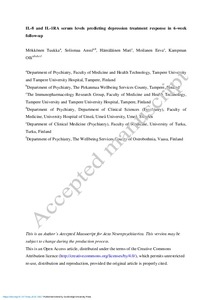 Results: Higher baseline serum IL-1Ra and IL-8 levels were associated with a smaller relative change in the MADRS-score within the first six weeks of treatment in linear regression analysis (p<0.001 and p=0.007, respectively). In further analysis comparing groups with ≤ 24 and > 24 MADRS score only the ≤ 24 MADRS score group showed a similar association.