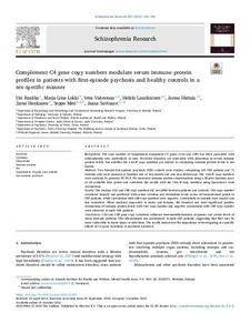 Two Finnish first-episode psychosis (FEP) cohorts were studied, comprising 105 FEP patients and 71 controls who were assessed at baseline and at two-month and one-year follow-ups. The C4A/B copy numbers were analyzed by genomic RT-PCR. We measured immune protein concentrations using a 38-plex Luminex assay at all available time points and correlated the results with the C4A/B copy numbers using Spearman's rank correlations.