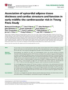 Aims: Previous studies who have reported associations between higher epicardial adipose tissue (EAT) and alterations in cardiac geometry and function are mainly derived from older adults. In this cross-sectional study, we examined whether these relations are also seen in the young and middle-aged study population of the Cardiovascular Risk in Young Finns Study (YFS).